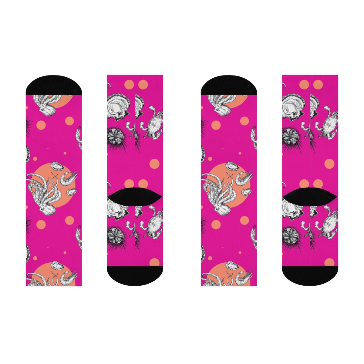 Embrace the ocean’s charm and add a splash of marine magic to your sock drawer with our “Seafood Soiree” Octopus & Oyster Pink Socks. Order yours today and enter a world of aquatic elegance and culinary delight!