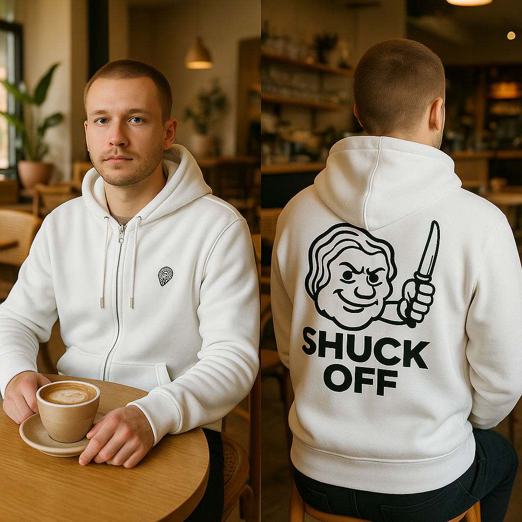 Tell the world exactly how you feel with the Shuck Off White Zip Hoodie — a bold oyster merch essential that mixes comfort, style, and raw oyster-bar energy. Featuring a fierce oyster character gripping a shucking knife with the words “Shuck Off” printed underneath, this hoodie is built for chefs, shuckers, and seafood lovers who aren’t afraid to bring some attitude.